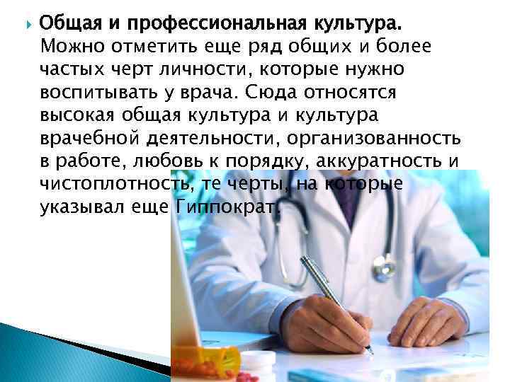 Общая и профессиональная культура. Можно отметить еще ряд общих и более частых черт личности, которые нужно воспитывать у врача. Сюда относятся высокая общая культура и культура врачебной деятельности, организованность в работе, любовь к порядку, аккуратность и чистоплотность, те черты, на которые указывал еще Гиппократ.