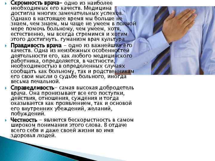 Скромность врача- одно из наиболее необходимых его качеств. Медицина достигла многих замечательных успехов. Однако в настоящее время мы больше не знаем, чем знаем, мы чаще не умеем в полной мере помочь больному, чем умеем, хотя, естественно, мы всегда стремимся и хотим этого достигнуть. гуманизм врач культура Правдивость врача - одно из важнейших его качеств. Одна из неизбежных особенностей деятельности его, как любого медицинского работника, определяется, в частности, необходимостью в определенных случаях сообщать как больному, так и родственникам его свои мысли о судьбе больного, иногда весьма печальной. Справедливость- самая высокая добродетель врача. Она пронизывает все его поступки, действия, отношения, суждения и тогда оказывается как проявлением, так и основой его внутренних убеждений, желаний, побуждений. Честность - является бескорыстность в самом широком понимании этого слова. В отдаче всего себя и даже своей жизни во имя здоровья людей.