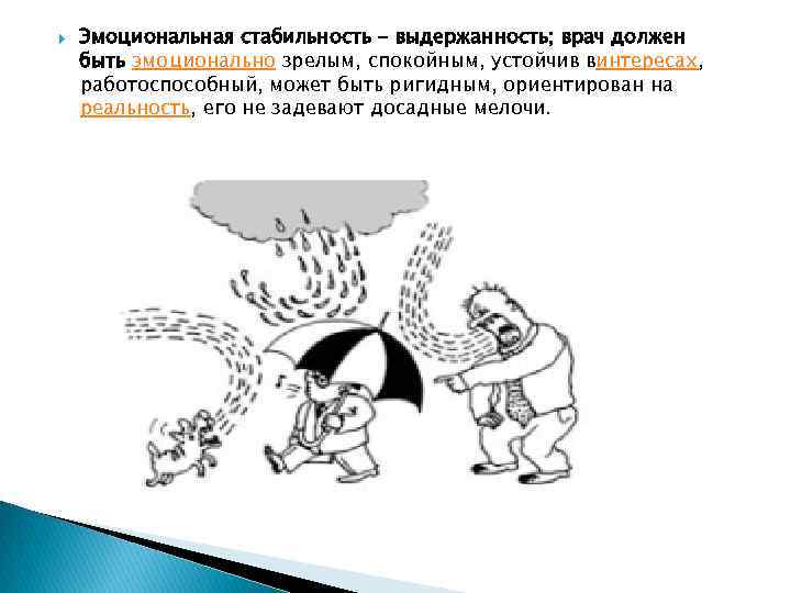 Эмоциональная стабильность - выдержанность; врач должен быть эмоционально зрелым, спокойным, устойчив винтересах, работоспособный, может быть ригидным, ориентирован на реальность, его не задевают досадные мелочи.