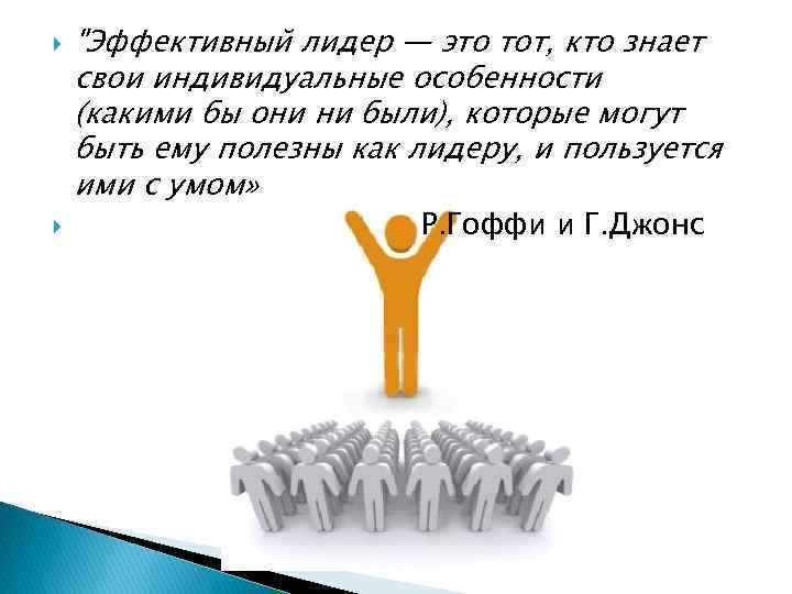 "Эффективный лидер — это тот, кто знает свои индивидуальные особенности (какими бы они ни были), которые могут быть ему полезны как лидеру, и пользуется ими с умом» Р. Гоффи и Г. Джонс