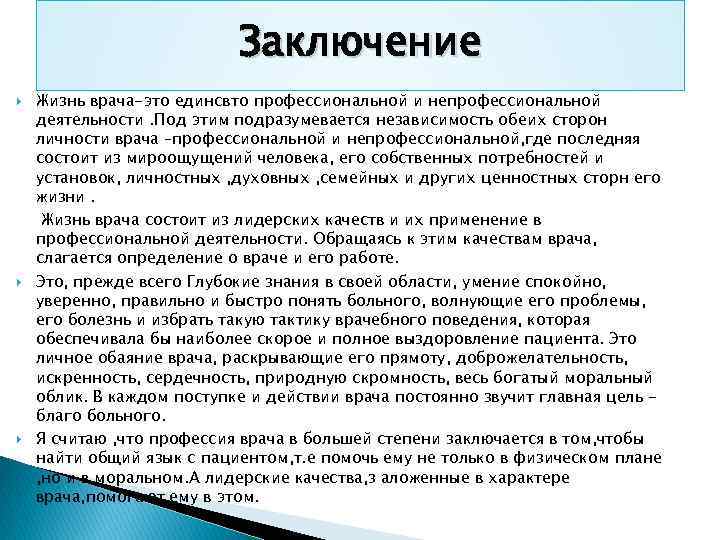 Заключение Жизнь врача-это единсвто профессиональной и непрофессиональной деятельности. Под этим подразумевается независимость обеих сторон личности врача –профессиональной и непрофессиональной, где последняя состоит из мироощущений человека, его собственных потребностей и установок, личностных , духовных , семейных и других ценностных сторн его жизни. Жизнь врача состоит из лидерских качеств и их применение в профессиональной деятельности. Обращаясь к этим качествам врача, слагается определение о враче и его работе. Это, прежде всего Глубокие знания в своей области, умение спокойно, уверенно, правильно и быстро понять больного, волнующие его проблемы, его болезнь и избрать такую тактику врачебного поведения, которая обеспечивала бы наиболее скорое и полное выздоровление пациента. Это личное обаяние врача, раскрывающие его прямоту, доброжелательность, искренность, сердечность, природную скромность, весь богатый моральный облик. В каждом поступке и действии врача постоянно звучит главная цель благо больного. Я считаю , что профессия врача в большей степени заключается в том, чтобы найти общий язык с пациентом, т. е помочь ему не только в физическом плане , но и в моральном. А лидерские качества, з аложенные в характере врача, помогают ему в этом.