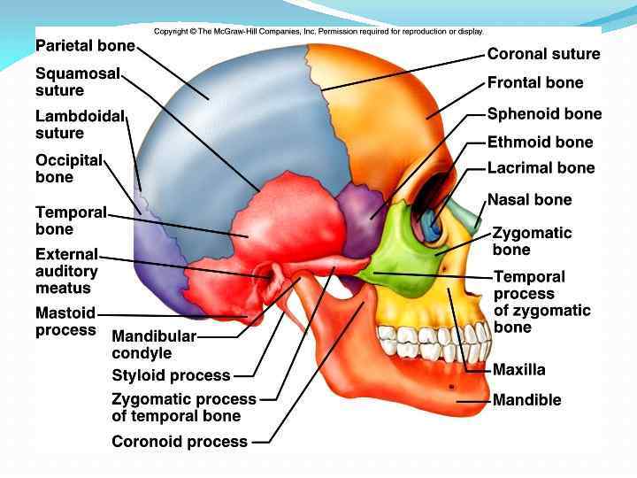 The skull 8 sutured bones in cranium Facial bones: 13 sutured bones, 1 mandible Cranium encases brain attachments for muscles sinuses