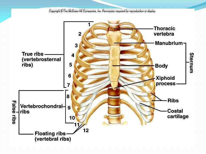 Thoracic cage ü ribs ü thoracic vertebrae ü sternum ü costal cartilages v True ribs are directly attached to the sternum pairs) v Three false ribs are joined to the 7 th rib Two pairs of floating ribs (first seven
