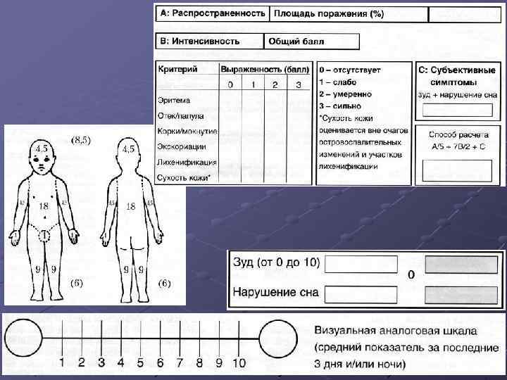 Диагностические критерии главные Кожный зуд Типичная морфология Хроническое рецидивирующее течение Начало заболевания в раннем возрасте Атопия в анамнезе или наследственная предрасположенность к ней