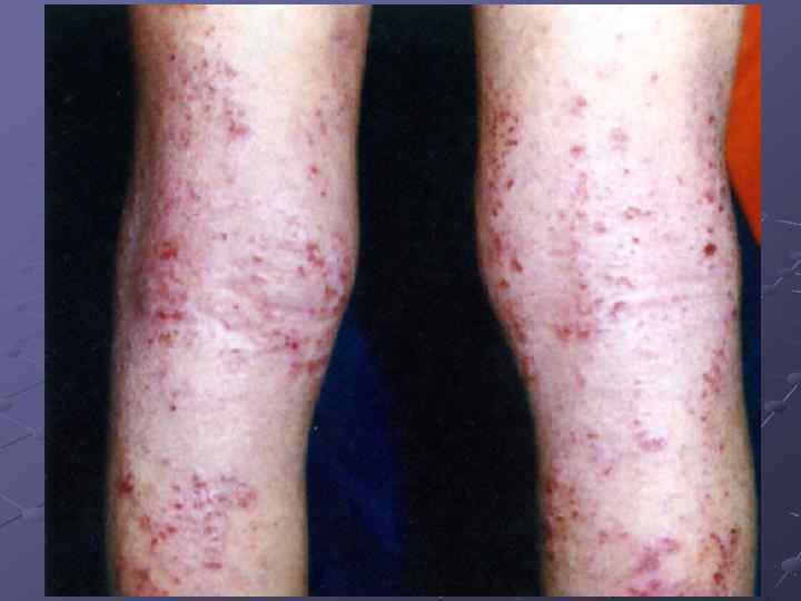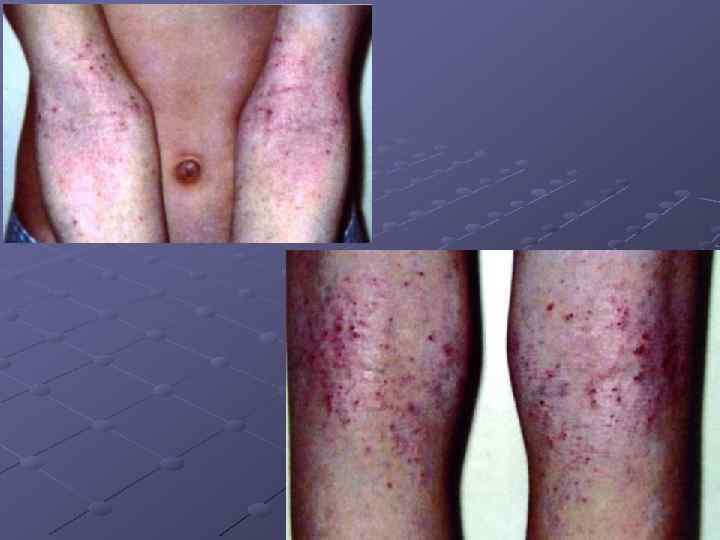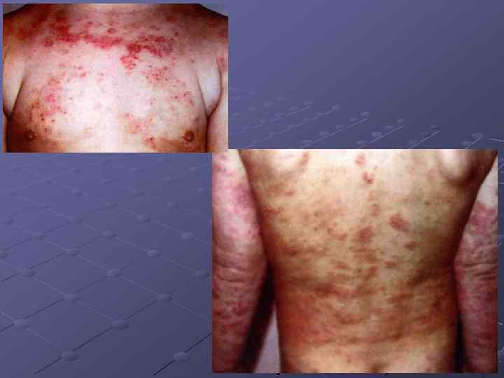 Диагностические критерии дополнительные Ксероз Ихтиоз Немедленная реакция при кожном тестировании Повышенный уровень Ig. E Эозинофилия в крови Инфекционные поражения кожи (стафилококк, герпес) Локализация на кистях и стопах Экзема сосков Рецидивирующие конъюктивиты Суборбитальные складки Денни Моргана Периорбитальная гиперпигментация, темные круги под глазами Катаракта, кератоконус Эритродермия Белый дермографизм