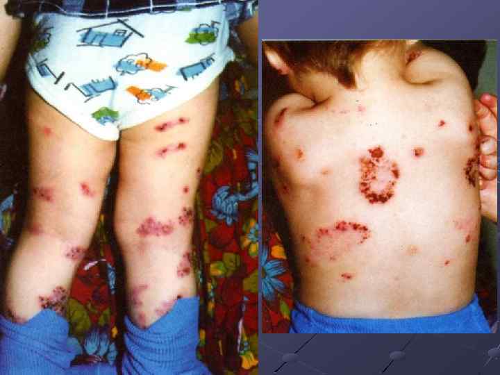 Первые симптомы развиваются в наиболее васкуляризованных участках кожи: лицо, разгибательные поверхности рук и ног и ягодичной области, подвергающейся постоянному раздражающему воздействию