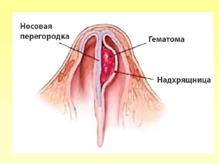Гематомы и абсцессы перегородки носа Гематома перегородки носа — травматическое или спонтанное кровоизлияние и скопление крови между надхрящницей и хрящом (надкостницей и костью) перегородки носа, обычно вызывающее сужение общего носового хода. Причина: травматическое повреждение (бытовое, постоперационное и др. ) без разрыва слизистой оболочки, при котором создается возможность скопления крови. Гематома может быть одно или двусторонней. Обычно она локализуется в хрящевом отделе перегородки, но может распространяться и на задние костные отделы.