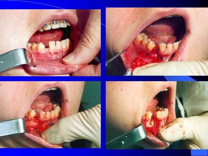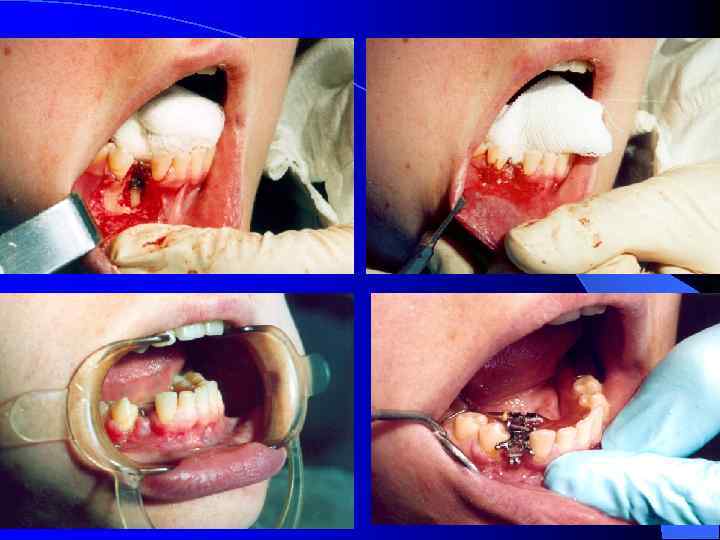 Хирургический этап лечения рецидивирующего дистального прикуса Множественная остеоперфорация по периметру вокруг корней премоляров верхней и нижней челютей конусовидным бором, с сохранением компактной пластинки прилежащей к корню, отступя на 1, 5 мм. l