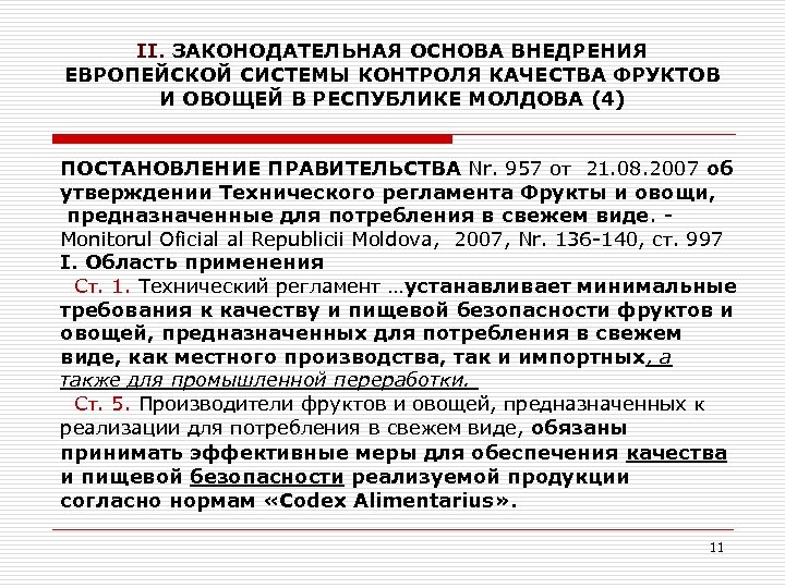 II. ЗАКОНОДАТЕЛЬНАЯ ОСНОВА ВНЕДРЕНИЯ ЕВРОПЕЙСКОЙ СИСТЕМЫ КОНТРОЛЯ КАЧЕСТВА ФРУКТОВ И ОВОЩЕЙ В РЕСПУБЛИКЕ МОЛДОВА (3) ПОСТАНОВЛЕНИЕ ПРАВИТЕЛЬСТВА Nr. 957 от 21. 08. 2007 об утверждении Технического регламента Фрукты и овощи, предназначенные для потребления в свежем виде. - Monitorul Oficial al Republicii Moldova, 2007, Nr. 136 -140, cт. 997 ГЛАВНЫЕ ОСОБЕННОСТИ: o. Стандарты ЕЭК ООН o. Качество o. Безопасность 10