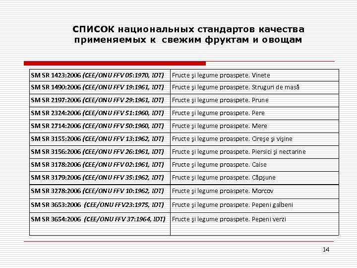 СПИСОК национальных стандартов качества применяемых к свежим фруктам и овощам SM 57: 1998 Fructe proaspete. Zizifus. Condiţii tehnice SM 58: 2004 Fructe proaspete. Zarzăre. Condiţii tehnice SM 120: 1996 Fructe proaspete. Zmeură. Condiţii tehnice SM 211: 2000 Legume proaspete. Verdeţuri condimentate. Condiţii tehnice SM 212: 2000 Legume proaspete. Rădăcini de legume. Condiţii tehnice SM 243: 2004 (CEE/ONU FFV-25: 2001, MOD) Legume. Ceapă. Condiţii tehnice SM 244: 2004 (CEE/ONU FFV-18: 1998, MOD) Legume. Usturoi. Condiţii tehnice SM 245: 2005 (CEE/ONU FFV-36: 2000, MOD) Legume proaspete. Tomate. Condiţii tehnice SM SR 1416: 2006 (CEE/ONU FFV 15: 1964, IDT) Fructe şi legume proaspete. Castraveţi SM SR 1417: 2006 (CEE/ONU FFV 41: 1988, IDT) Fructe şi legume proaspete. Dovleci SM SR 1418: 2006 (CEE/ONU FFV 09: 1994, IDT) Fructe şi legume. Varză 13