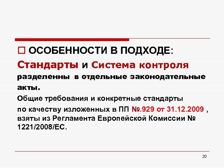 o ОСОБЕННОСТИ В ПОДХОДЕ: Стандарты И Система контроля разделенны в отдельные законодательные акты. Общие требования и конкретные стандарты по качеству изложенных в ПП №. 929 от 31. 12. 2009 , взяты из Регламента Европейской Комиссии № 1221/2008/EC. 20