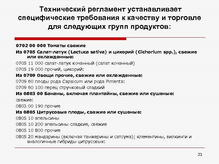 Технический регламент устанавливает специфические требования к качеству и торговле для следующих групп продуктов: 0702 00 000 Томаты свежие Из 0705 Салат-латук (Lаctucа sаtivа) и цикорий (Cichorium sрр. ), свежие или охлажденные: 0705 11 000 салат-латук кочанный (салат кочанный) 0705 19 000 прочий, цикорий: Из 0709 Овощи прочие, свежие или охлажденные: 0709 60 плоды рода Cарsicum или рода Рimentа: 0709 60 100 перец стручковый сладкий Из 0803 00 Бананы, включая плантайны, свежие или сушеные: свежие: 0803 00 190 прочие Из 0805 Цитрусовые плоды, свежие или сушеные: 0805 10 апельсины 0805 10 200 апельсины сладкие, свежие 0805 10 800 прочие 0805 20 мандарины (включая танжерины и сатсума); клементины, вилкинги и аналогичные гибриды цитрусовых: 23