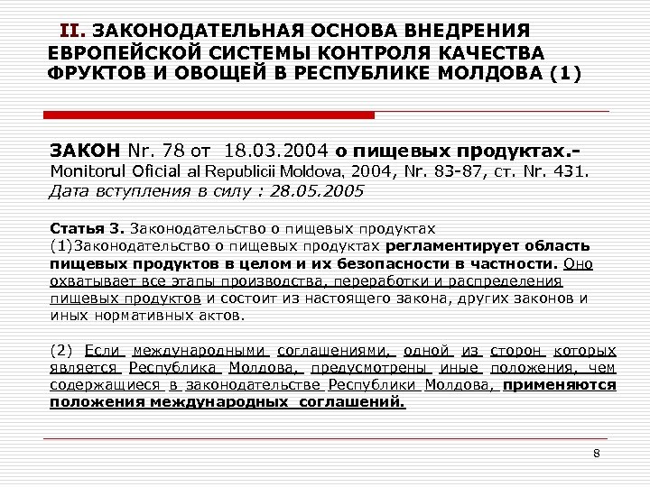 II. ЗАКОНОДАТЕЛЬНАЯ ОСНОВА ВНЕДРЕНИЯ ЕВРОПЕЙСКОЙ СИСТЕМЫ КОНТРОЛЯ КАЧЕСТВА ФРУКТОВ И ОВОЩЕЙ В РЕСПУБЛИКЕ МОЛДОВА (1) ЗАКОН Nr. 78 от 18. 03. 2004 о пищевых продуктах. - Monitorul Oficial al Republicii Moldova, 2004, Nr. 83 -87, ст. Nr. 431. Дата вступления в силу : 28. 05. 2005 Статья 3. Законодательство о пищевых продуктах (1) Законодательство о пищевых продуктах регламентирует область пищевых продуктов в целом и их безопасности в частности. Оно охватывает все этапы производства, переработки и распределения пищевых продуктов и состоит из настоящего закона, других законов и иных нормативных актов. (2) Если международными соглашениями, одной из сторон которых является Республика Молдова, предусмотрены иные положения, чем содержащиеся в законодательстве Республики Молдова, применяются положения международных соглашений. 8