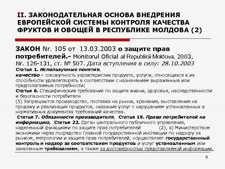 II. ЗАКОНОДАТЕЛЬНАЯ ОСНОВА ВНЕДРЕНИЯ ЕВРОПЕЙСКОЙ СИСТЕМЫ КОНТРОЛЯ КАЧЕСТВА ФРУКТОВ И ОВОЩЕЙ В РЕСПУБЛИКЕ МОЛДОВА (2) ЗАКОН Nr. 105 от 13. 03. 2003 о защите прав потребителей. - Monitorul Oficial al Republicii Moldova, 2003, Nr. 126 -131, ст. № 507. Дата вступления в силу: 28. 10. 2003 Cтатья 1. Используемые понятия. качество - совокупность характеристик продукта, услуги, относящихся к их способности удовлетворять в соответствии с назначением выраженные или предполагаемые потребности; Статья 6. Специфические требования по защите жизни, здоровья, наследственности и безопасности потребителя (5) Запрещаются производство, поставка на рынок, хранение, выставление на продажу и реализация продуктов, оказание услуг с нарушением установленных в нормативных документах требований качества. Статья 7. Обязанности производителя, Статья 19. Право потребителей на информацию, Статья 22. Орган центрального публичного управления, наделенный функциями по защите прав потребителей (2), a) Министерством экономики через посредство Главной государственной инспекции по надзору за рынком, метрологии и защите прав потребителей, осуществляет государственный контроль и надзор за соответствием продуктов и услуг установленным или заявленным требованиям, а также за достоверностью представляемой информации. 9