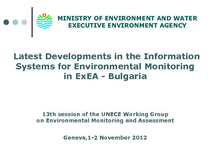 MINISTRY OF ENVIRONMENT AND WATER EXECUTIVE ENVIRONMENT AGENCY Latest Developments in the Information Systems for Environmental Monitoring in Ex. EA - Bulgaria 13 th session of the UNECE Working Group on Environmental Monitoring and Assessment Geneva, 1 -2 November 2012