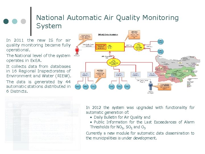 National Automatic Air Quality Monitoring System In 2011 the new IS for air quality monitoring became fully operational. The National level of the system operates in Ex. EA. It collects data from databases in 16 Regional Inspectorates of Environment and Water (RIEW). The data is generated by 44 automatic stations distributed in 6 Districts. In 2012 the system was upgraded with functionality for automatic generation of: • Daily Bulletin for Air Quality and • Public Information for the Last Exceedances of Alarm Thresholds for NO 2, SO 2 and O 3 Currently a new module for automatic data dissemination to the municipalities is under development.