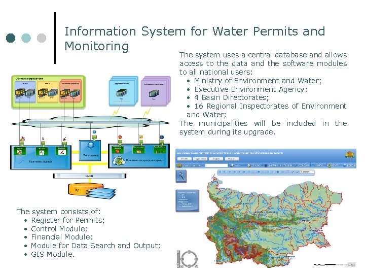 Information System for Water Permits and Monitoring The system uses a central database and allows access to the data and the software modules to all national users: • Ministry of Environment and Water; • Executive Environment Agency; • 4 Basin Directorates; • 16 Regional Inspectorates of Environment and Water; The municipalities will be included in the system during its upgrade. The system consists of: • Register for Permits; • Control Module; • Financial Module; • Module for Data Search and Output; • GIS Module.