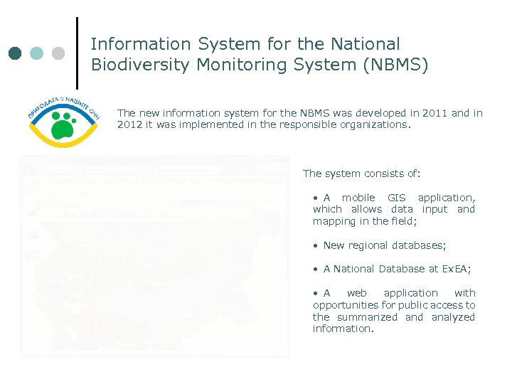 Information System for the National Biodiversity Monitoring System (NBMS) The new information system for the NBMS was developed in 2011 and in 2012 it was implemented in the responsible organizations. The system consists of: • A mobile GIS application, which allows data input and mapping in the field; • New regional databases; • A National Database at Ex. EA; • A web application with opportunities for public access to the summarized analyzed information.