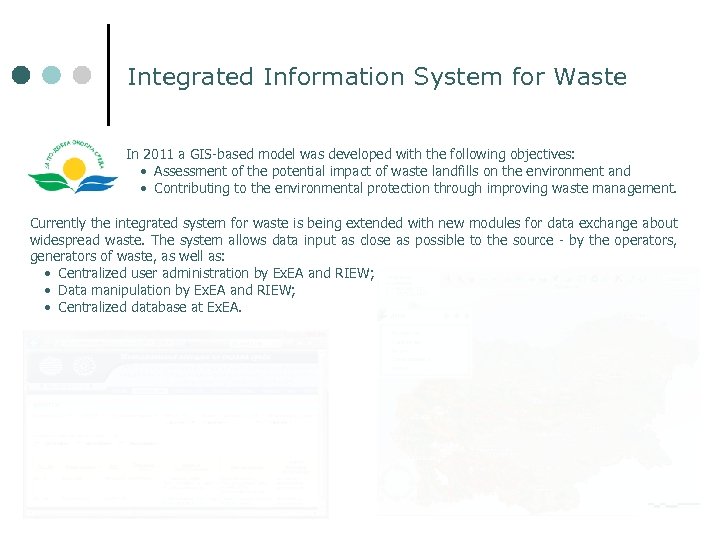 Integrated Information System for Waste In 2011 a GIS-based model was developed with the following objectives: • Assessment of the potential impact of waste landfills on the environment and • Contributing to the environmental protection through improving waste management. Currently the integrated system for waste is being extended with new modules for data exchange about widespread waste. The system allows data input as close as possible to the source - by the operators, generators of waste, as well as: • Centralized user administration by Ex. EA and RIEW; • Data manipulation by Ex. EA and RIEW; • Centralized database at Ex. EA.