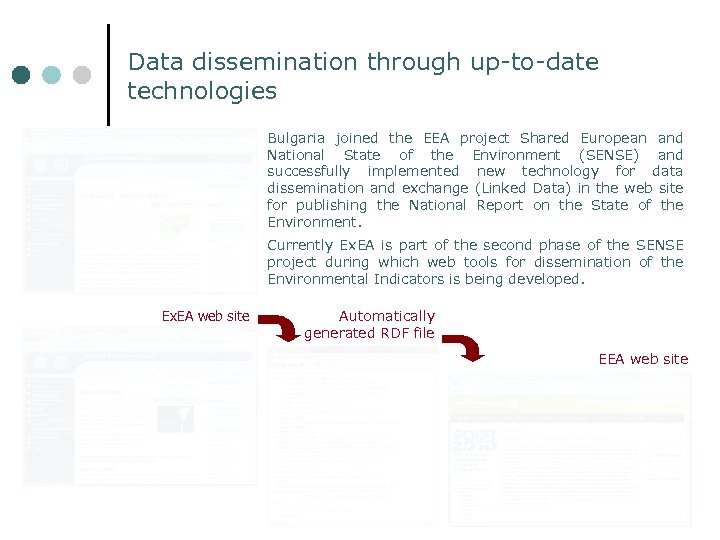 Data dissemination through up-to-date technologies Bulgaria joined the EEA project Shared European and National State of the Environment (SENSE) and successfully implemented new technology for data dissemination and exchange (Linked Data) in the web site for publishing the National Report on the State of the Environment. Currently Ex. EA is part of the second phase of the SENSE project during which web tools for dissemination of the Environmental Indicators is being developed. Ex. EA web site Automatically generated RDF file EEA web site