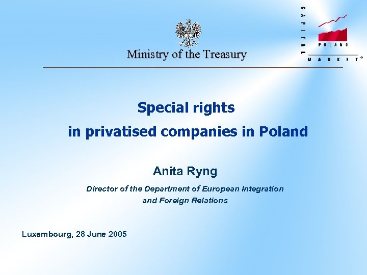 Ministry of the Treasury Special rights in privatised companies in Poland Anita Ryng Director of the Department of European Integration and Foreign Relations Luxembourg, 28 June 2005