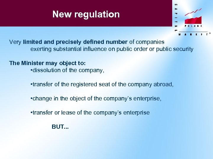 New regulation Very limited and precisely defined number of companies exerting substantial influence on public order or public security The Minister may object to: • dissolution of the company, • transfer of the registered seat of the company abroad, • change in the object of the company’s enterprise, • transfer or lease of the company’s enterprise BUT. . .