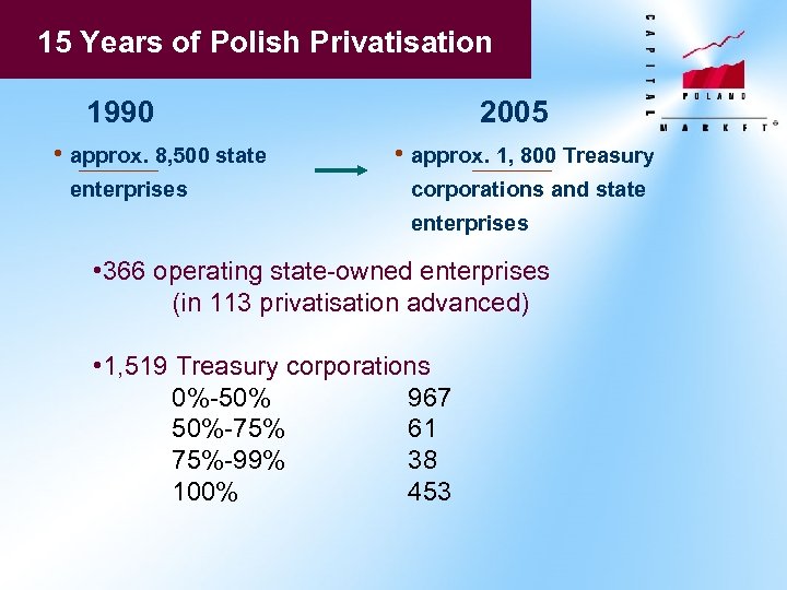 15 Years of Polish Privatisation 1990 • approx. 8, 500 state enterprises 2005 • approx. 1, 800 Treasury corporations and state enterprises • 366 operating state-owned enterprises (in 113 privatisation advanced) • 1, 519 Treasury corporations 0%-50% 967 50%-75% 61 75%-99% 38 100% 453