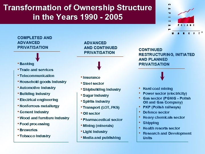 Transformation of Ownership Structure in the Years 1990 - 2005 COMPLETED AND ADVANCED PRIVATISATION • Banking • Trade and services • Telecommunication • Household goods industry • Automotive industry • Building industry • Electrical engineering • Nonferrous metallurgy • Cement industry • Wood and furniture industry • Food processing • Breweries • Tobacco industry ADVANCED AND CONTINUED PRIVATISATION • Insurance • Steel sector • Shipbuilding industry • Sugar industry • Spirits industry • Transport (LOT, PKS) • Oil sector • Pharmaceutical sector • Mining (minerals) • Light industry • Media and publishing CONTINUED RESTRUCTURING, INITIATED AND PLANNED PRIVATISATION • Hard coal mining • Power sector (electricity) • Gas sector (PGNi. G - Polish • • • Oil and Gas Company) PKP (Polish railways) Defence sector Heavy chemicals sector Shipping Health resorts sector Research and Development Units