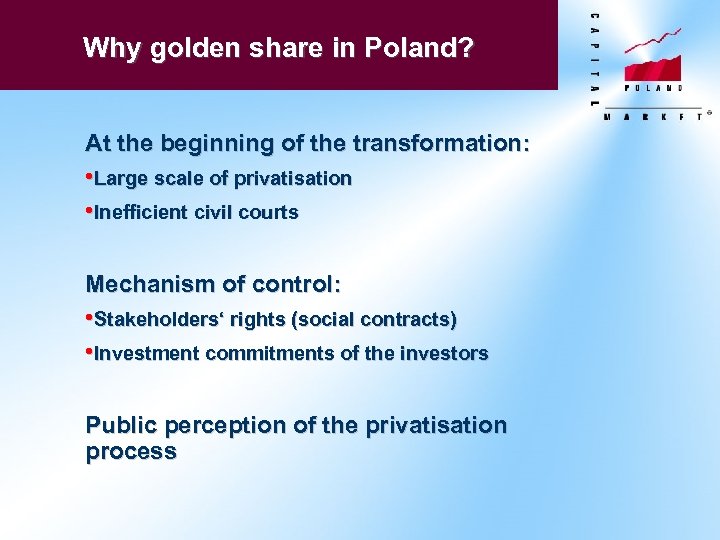 Why golden share in Poland? At the beginning of the transformation: • Large scale of privatisation • Inefficient civil courts Mechanism of control: • Stakeholders‘ rights (social contracts) • Investment commitments of the investors Public perception of the privatisation process