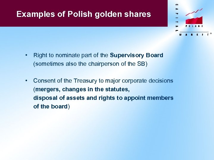 Examples of Polish golden shares • Right to nominate part of the Supervisory Board (sometimes also the chairperson of the SB) • Consent of the Treasury to major corporate decisions (mergers, changes in the statutes, disposal of assets and rights to appoint members of the board)