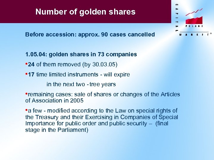 Number of golden shares Before accession: approx. 90 cases cancelled 1. 05. 04: golden shares in 73 companies • 24 of them removed (by 30. 03. 05) • 17 time limited instruments - will expire in the next two - tree years • remaining cases: sale of shares or changes of the Articles of Association in 2005 • a few - modified according to the Law on special rights of the Treasury and their Exercising in Companies of Special Importance for public order and public security – (final stage in the Parliament)