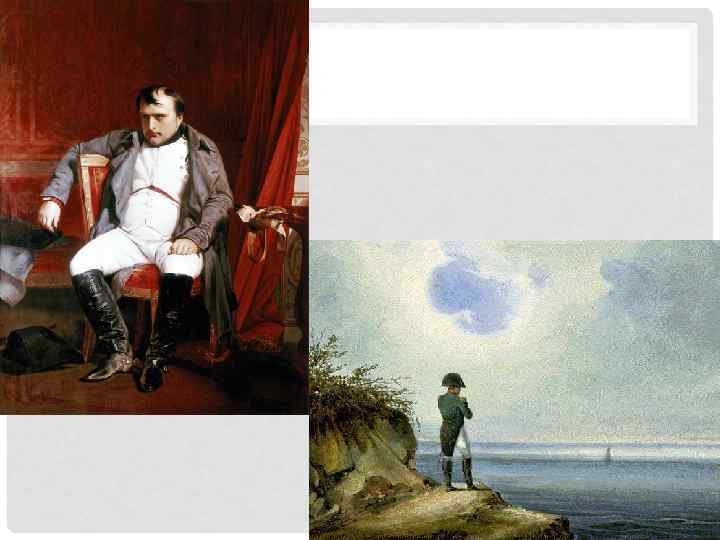 СОБЫТИЯ ПОСЛЕ 1810 ГОДА • Сначала – освободитель и республиканец, потом – тиран и завоеватель • 1810 год – экономический кризис, усталость от высоких налогов и затянувшейся войны • Военные поражения в России (1812) и под Лейпцигом (1813) • 1814 – свержение, попытка самоубийства и изгнание • 20 марта – 22 июня 1815 г. – «Сто дней» • Ватерлоо, бегство из Франции, английский плен, ссылка на остров Св. Елены, смерть в 1821 г.
