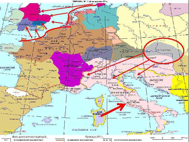 Великое переселение народов Причины: ü нашествие гуннов (из Азии в Европу), эффект домино ü возможно, изменение климата, похолодание в V-VI вв. на севере Европы ü ослабление Римской империи в силу внутренней борьбы за власть и других причин, желание варварских племен захватить развитые римские территории и города