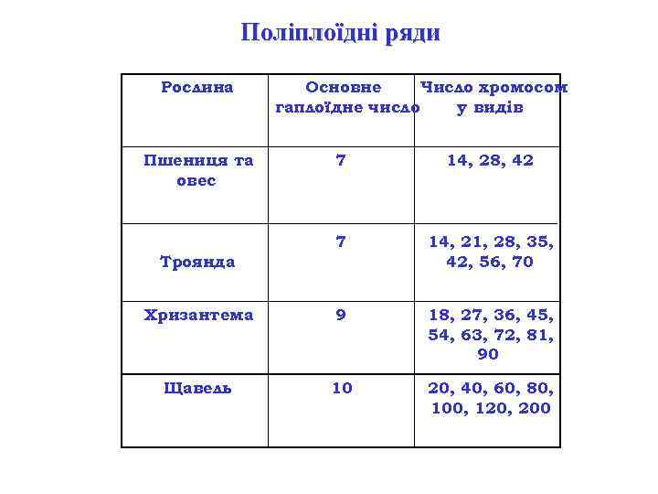 Поліплоїдні ряди Рослина Пшениця та овес Основне Число хромосом гаплоїдне число у видів 7 14, 28, 42 7 14, 21, 28, 35, 42, 56, 70 Хризантема 9 18, 27, 36, 45, 54, 63, 72, 81, 90 Щавель 10 20, 40, 60, 80, 100, 120, 200 Троянда