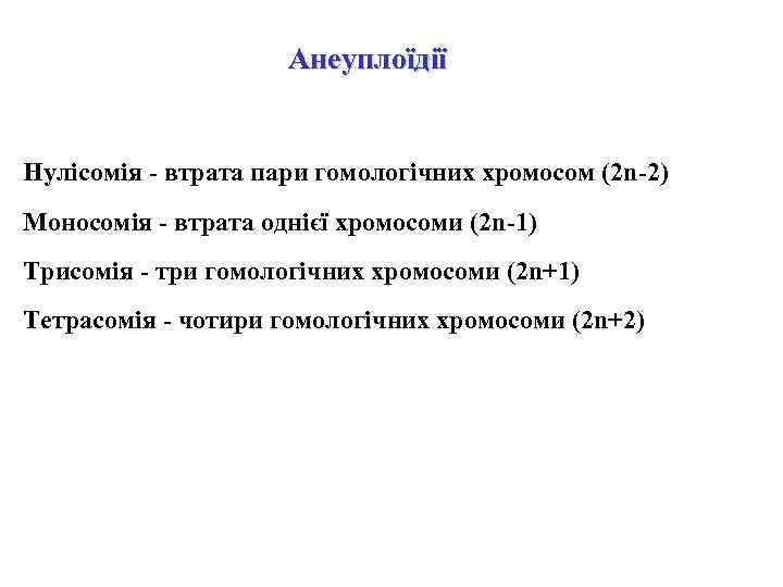 Анеуплоїдії Нулісомія - втрата пари гомологічних хромосом (2 n-2) Моносомія - втрата однієї хромосоми (2 n-1) Трисомія - три гомологічних хромосоми (2 n+1) Тетрасомія - чотири гомологічних хромосоми (2 n+2)
