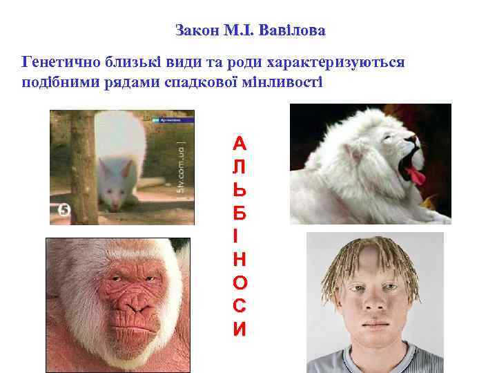 Закон М. І. Вавілова Генетично близькі види та роди характеризуються подібними рядами спадкової мінливості А Л Ь Б І Н О С И