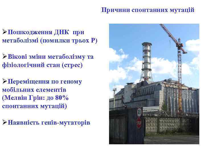 Причини спонтанних мутацій Пошкодження ДНК при метаболізмі (помилки трьох Р) Вікові зміни метаболізму та фізіологічний стан (стрес) Переміщення по геному мобільних елементів (Мелвін Грін: до 80% спонтанних мутацій) Наявність генів-мутаторів
