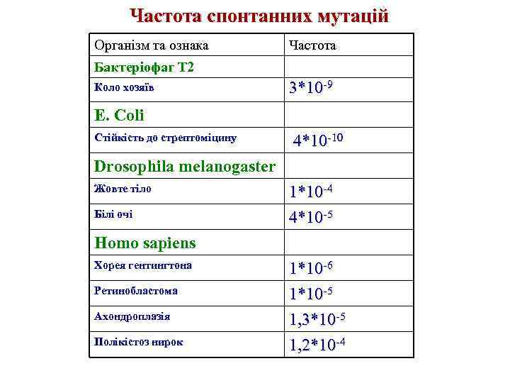 Частота спонтанних мутацій Організм та ознака Частота Бактеріофаг Т 2 Коло хозяїв 3*10 -9 E. Coli Стійкість до стрептоміцину 4*10 -10 Drosophila melanogaster Жовте тіло Білі очі 1*10 -4 4*10 -5 Homo sapiens Хорея гентингтона Ретинобластома Ахондроплазія Полікістоз нирок 1*10 -6 1*10 -5 1, 3*10 -5 1, 2*10 -4