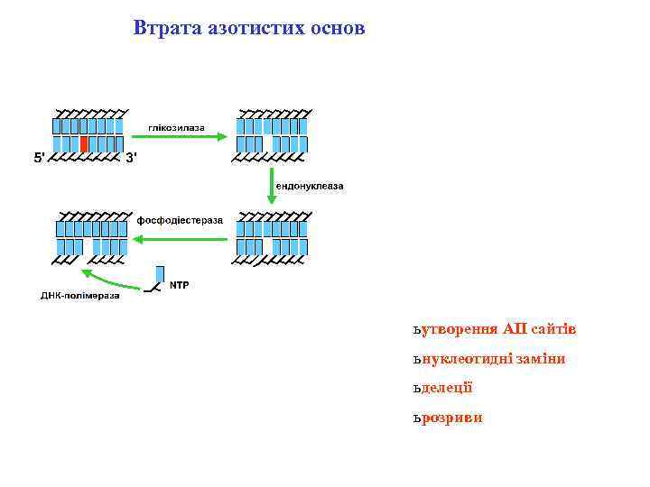 Втрата азотистих основ ь утворення АП сайтів ь нуклеотидні заміни ь делеції ь розриви