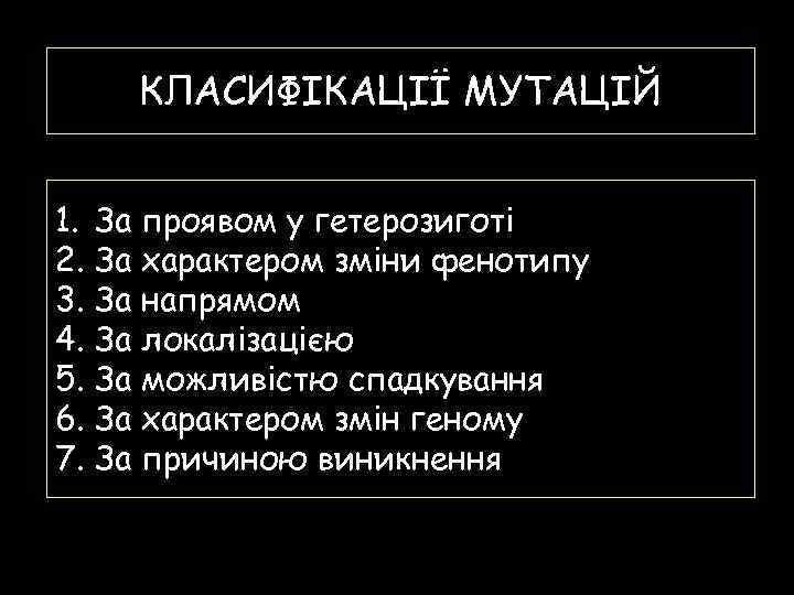 КЛАСИФІКАЦІЇ МУТАЦІЙ 1. 2. 3. 4. 5. 6. 7. За проявом у гетерозиготі За характером зміни фенотипу За напрямом За локалізацією За можливістю спадкування За характером змін геному За причиною виникнення