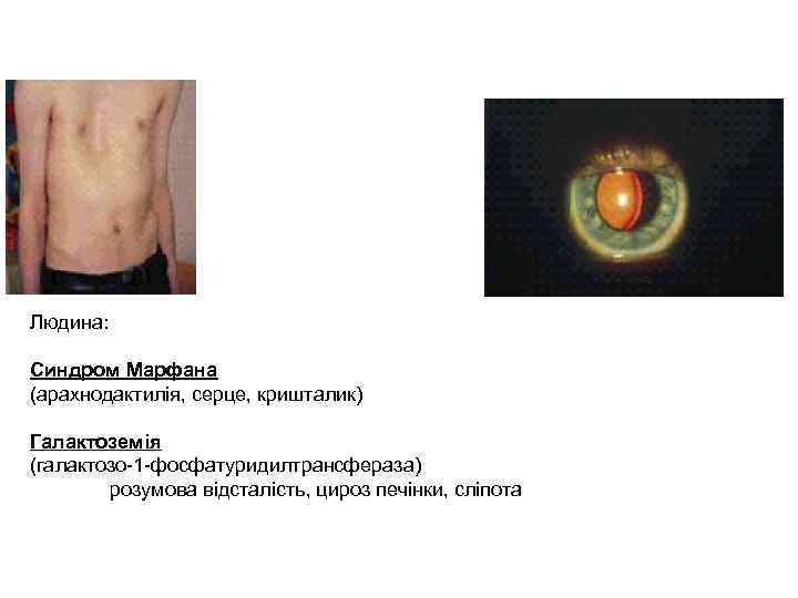 Людина: Синдром Марфана (арахнодактилія, серце, кришталик) Галактоземія (галактозо-1 -фосфатуридилтрансфераза) розумова відсталість, цироз печінки, сліпота