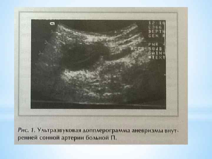 Материал и методы 11 больных аневризмой экстракраниального отдела ВСА. Обследование больных, согласно протоколу РНЦХ им. Б. В. Петровского РАМН и плану пред-операционной подготовки, включало: *электрокардиографию, *рентгенологическое исследование органов грудной клетки, *эхокардиографию, *спирографию, *ультразвуковое исследование органов брюшной полости, *ультразвуковое дуплексное сканирование ветвей дуги аорты и артерий нижних конечностей. Для уточнения локализации, размеров и характера аневризмы применяли допплерографическое исследование, ангиографию и/или спиральную компьютерную томографию.