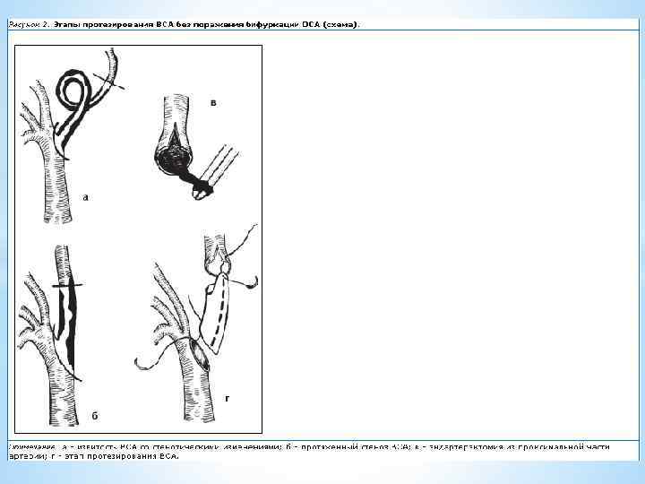 Техника операций протезирования сонных артерий Стандартный доступ по переднему краю грудиноключичнососцевидной мышцы. Все анастомозы накладывали непрерывным обвивным швом нитью пролен 5/0. Операционную рану ушивали редкими швами послойно с оставлением резинового выпускника в подкожной клетчатке. Протезирование ВСА без пластики бифуркации ОСА применяли при распространенном поражении ВСА без вовлечения в процесс бифуркации ОСА. Операция показана при сочетании стеноза и извитости ВСА, а также в отсутствие извитости ВСА.