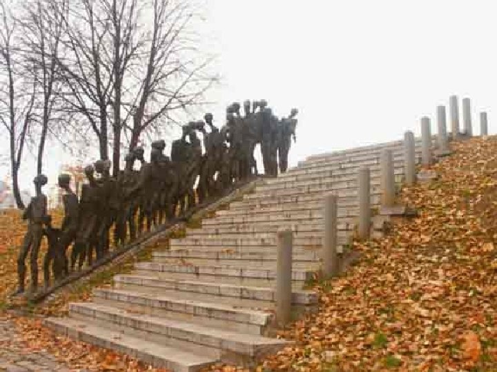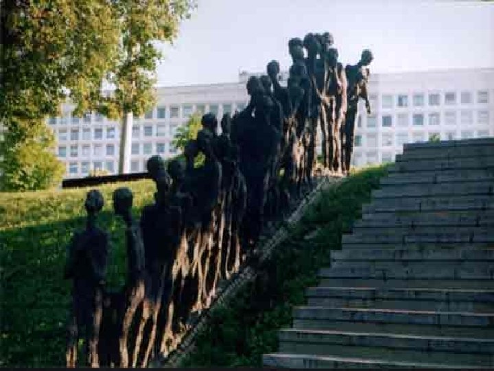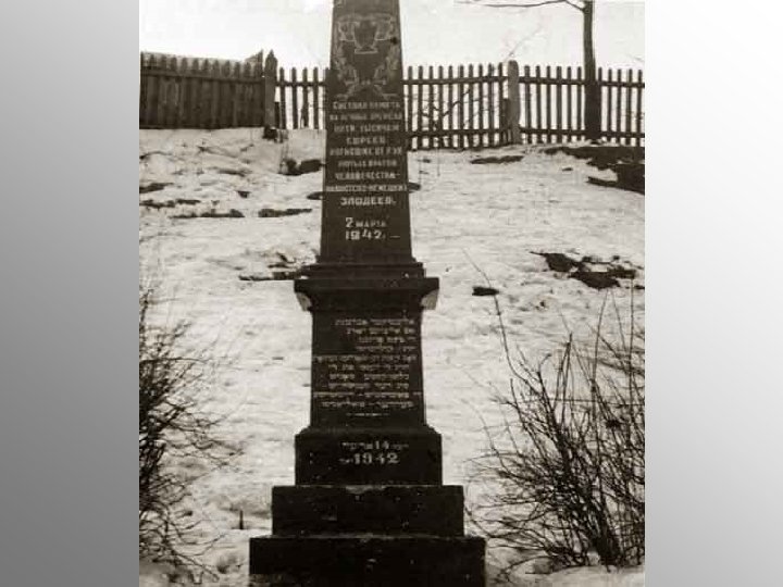Памятник Яма Из 2, 5 миллиона белорусских граждан, погибших во время Великой Отечественной войны, более чем 800 тысяч были узниками гетто. . . И об этом сегодня нельзя забывать. Хроника гибели гетто, которое в самом начале оккупации было создано для "удобства" ликвидации 100. 000 согнанных сюда лю началась ранней осенью 1941 года, когда было расстреляно 23. 804 чел. Затем массовые погромы проводились регулярно. Вот эти даты: 23 сентября 1941 г. 7 ноября 1941 г. 20 ноября 1941 г. , 2 марта 1942 г. , 28 июля 1942 г, октябрь 1943 г. Во время немецкой оккупации Юбилейная площадь, часть улиц Островского, Димитрова входили в границы еврейского гетто. И фашисты регулярно творили там погромы. Самую крупную карательную акцию оккупанты провели в марте 1942 года. В течение трех дней к оврагу на окраине гетто приводили большими группами узников и расстреливали их. Всего же в результате злодеяния, учиненного 2 марта 1942 года, было расстреляно более 5 тысяч евреев, включая 200 сирот из детского дома вместе с медперсоналом и воспитателями. Около 500 трупов свалили в яму, расположенную у пересечения нынешних улиц Заславской и Мельникайте. В "Черной книге" Василия Гроссмана и Ильи Эренбурга есть материал о трагедии Минского гетто, заканчивающийся словами: "21 октября 1943 года гетто было снова, в последний раз окружено гестаповцами. Людей, всех до единого, погрузили в машины и вывезли на смерть. В тех случаях, когда в квартирах никого не находили, дома взрывали гранатами, чтобы находящиеся в укрытиях обрели смерть". До освобождения белорусской столицы от оккупантов дожили лишь 13 узников гетто, укрывавшихся в склепе возле старого еврейского кладбища. С 1947 г. на этом месте стоял скромный обелиск с текстом на языке идиш: "Евреям - жертвам нацизма", построенный усилиями белорусских евреев. Так выглядел памятник в первые послевоенные годы.