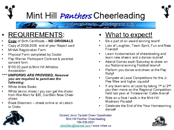 Mint Hill Panthers Cheerleading • REQUIREMENTS: • What to expect! • • Copy of Birth Certificate – NO ORIGINALS Copy of 2008 -2009 end of year Report card MHAA Registration Form Physical Form completed by Doctor Pop Warner Participant Contract & parental consent form. • $150. 00 paid to Mint Hill Athletics Association **** UNIFORMS ARE PROVIDED, However you are required to purchase the following: • White Ankle Socks • White tennis shoes / you can get the shoes from Wal-Mart for $20, Dan. Skin Now Cheer shoes • Black Bloomers – check online or at Lebo's or Dicks. • • Be a part of an award winning team! Lots of Laughter, Team Spirit, Fun and New Friends! Learn fundamentals of cheerleading and learn new cheers and a dance routine! Attend Games each Saturday to cheer on our National winning Football teams! Perform you dance and cheer at the Pep Rally! Compete at Local Competitions for the Jr Pee Wee and higher squads! If any team wins at Local by taking 1 st or 2 nd you then move on the Regional Competition held last year at Timewarner Cable Arena! Ride on a float / walk in the Mint Hill Madness Parade! Celebrate the End of the Year Homecoming dance! Contact Jenni Tackett Cheer Coordinator Mint Hill Panther Cheerleading 704 -930 -5931 ultmt 2 fan@hotmail. com / www. mhaa. us