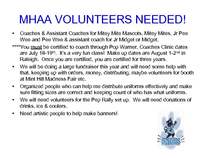 MHAA VOLUNTEERS NEEDED! • Coaches & Assistant Coaches for Mitey Mite Mascots, Mitey Mites, Jr Pee Wee and Pee Wee & assistant coach for Jr Midget or Midget. ****You must be certified to coach through Pop Warner, Coaches Clinic dates are July 18 -19 th. It’s a very fun class! Make up dates are August 1 -2 nd in Raleigh. Once you are certified, you are certified for three years. • We will be doing a large fundraiser this year and will need some help with that, keeping up with orders, money, distributing, maybe volunteers for booth at Mint Hill Madness Fair etc. • Organized people who can help me distribute uniforms effectively and make sure fitting sizes are correct and keeping count of who has what uniforms. • We will need volunteers for the Pep Rally set up. We will need donations of drinks, ice & coolers. • Need artistic people to help make banners!