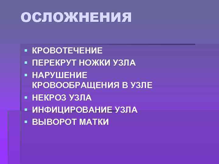 ОСЛОЖНЕНИЯ § КРОВОТЕЧЕНИЕ § ПЕРЕКРУТ НОЖКИ УЗЛА § НАРУШЕНИЕ КРОВООБРАЩЕНИЯ В УЗЛЕ § НЕКРОЗ УЗЛА § ИНФИЦИРОВАНИЕ УЗЛА § ВЫВОРОТ МАТКИ