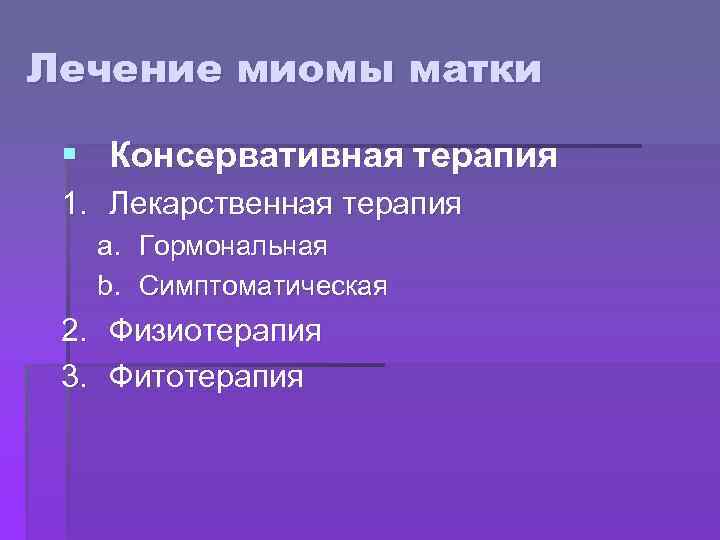 Лечение миомы матки § Консервативная терапия 1. Лекарственная терапия a. b. Гормональная Симптоматическая 2. Физиотерапия 3. Фитотерапия