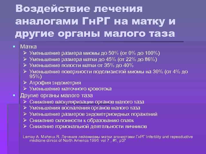 Воздействие лечения аналогами Гн. РГ на матку и другие органы малого таза § Матка Ø Ø Уменьшение размера миомы до 50% (от 0% до 100%) Уменьшение размера матки до 45% (от 22% до 86%) Уменьшение полости матки от 35% до 40% Уменьшение поверхности подслизистой миомы на 30% (от 4% до 95%) Ø Атрофия эндометрия Ø Уменьшение маточного кровотока § Другие органы малого таза Ø Ø Ø Снижение васкуляризации органов малого таза Уменьшения воспаления органов малого таза Уменьшение размеров эндометриоидных поражений Снижение склонности к образованию спаек Снижение гормональной деятельности яичников Lemay A. Maheux R. Лечение лейомиомы матки агонистами Гн. РГ Infertility and repeoductive medicine clinics of North America 1996: vol 7 , #1, p 37