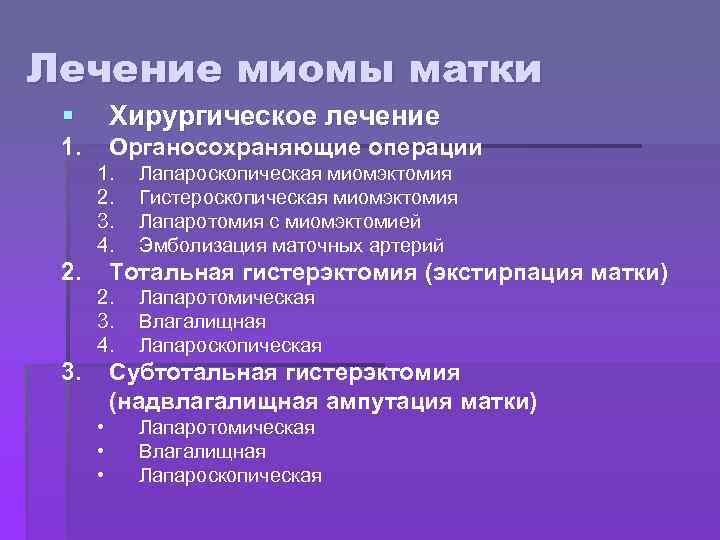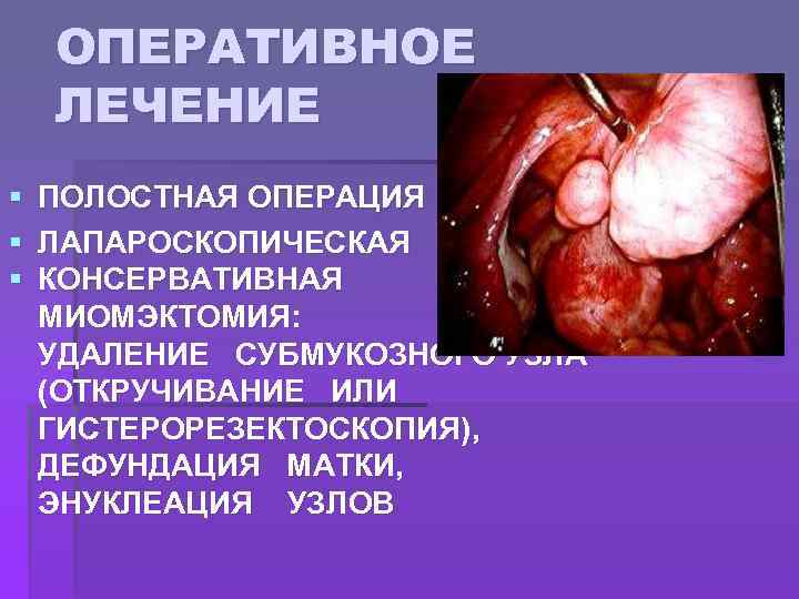 ОПЕРАТИВНОЕ ЛЕЧЕНИЕ § § § ПОЛОСТНАЯ ОПЕРАЦИЯ ЛАПАРОСКОПИЧЕСКАЯ ОПЕРАЦИЯ КОНСЕРВАТИВНАЯ МИОМЭКТОМИЯ: УДАЛЕНИЕ СУБМУКОЗНОГО УЗЛА (ОТКРУЧИВАНИЕ ИЛИ ГИСТЕРОРЕЗЕКТОСКОПИЯ), ДЕФУНДАЦИЯ МАТКИ, ЭНУКЛЕАЦИЯ УЗЛОВ